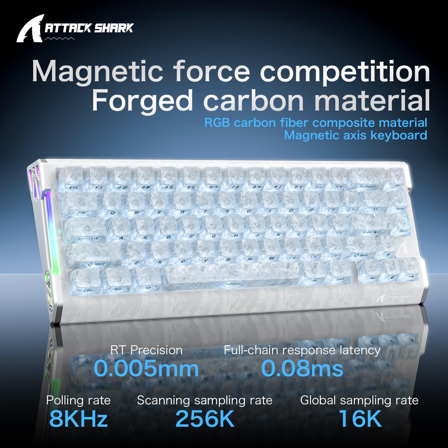 - đ€ăPremium CNC Trim & Forged Carbon Fiber DesignăATTACK SHARK R68HE magnetic keyboard features a compact design with a 60% layout, maximizing desk space and improving typing efficiency. This fully upgraded wired mechanical keyboard combines durability and aesthetics, utilizing advanced carbon fiber composite materials and CNC-machined aluminum alloy side trims (excluding the bottom) to create a lightweight yet robust structure. It combines classic tactile feedback with cutting-edge magnetic switch technology for ultra-sensitive operation.