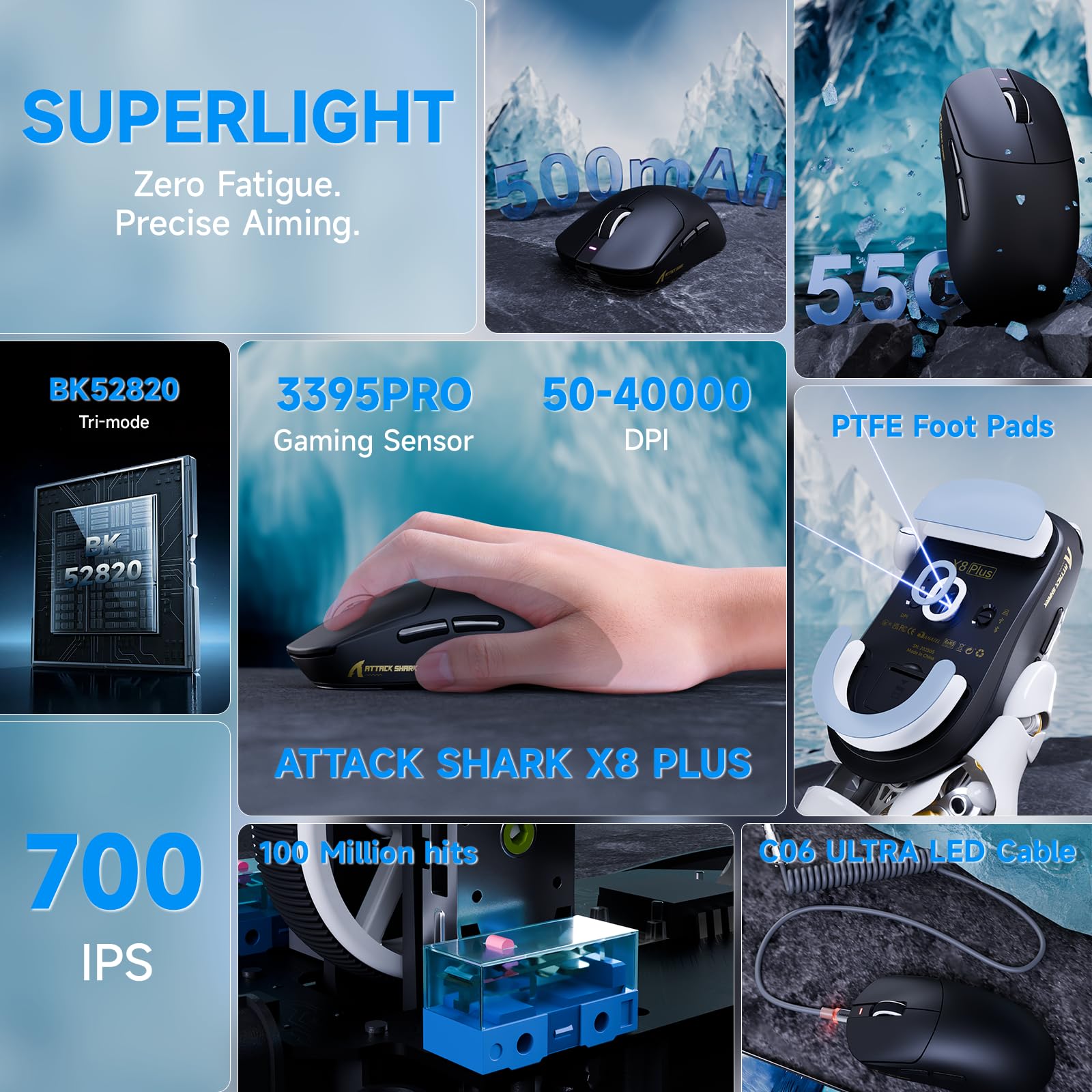 - ă3395PRO Sensor & 40K DPI ăPowered by the flagship PixArt PAW3395PRO sensor, the ATTACK SHARK X8Plus mouse supports up to 40,000 DPI for unmatched precision. With driver-enabled 50 DPI incremental tuning, you can fine-tune sensitivity to suit your exact needs. Delivers 700 IPS tracking speed and 60G acceleration for ultra-responsive, pixel-accurate controlâperfect for FPS, MOBA, and high-stakes competitive gaming.